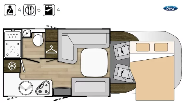 - Maximale Anzahl erlaubter Personen für den öffentlichen Strassenverkehr / Essplätze / Schlafplätze: 4 / 6 / 4